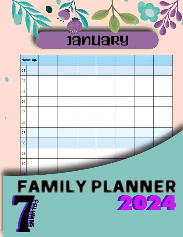 Family planner book 2024 with 7 columns: Family Calendar Monthly
